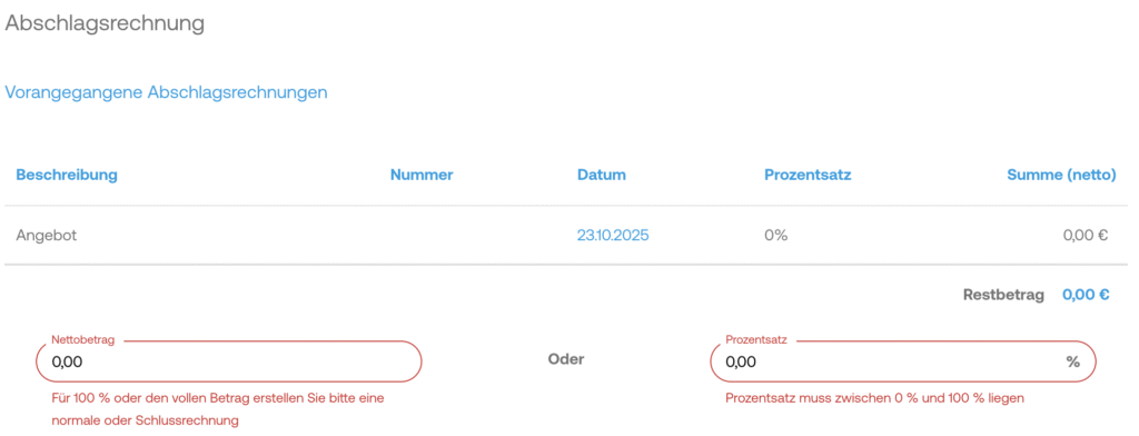 Anschließend klickst du auf „Rechnung erstellen“, um die Abschlagsrechnung zu finalisieren.