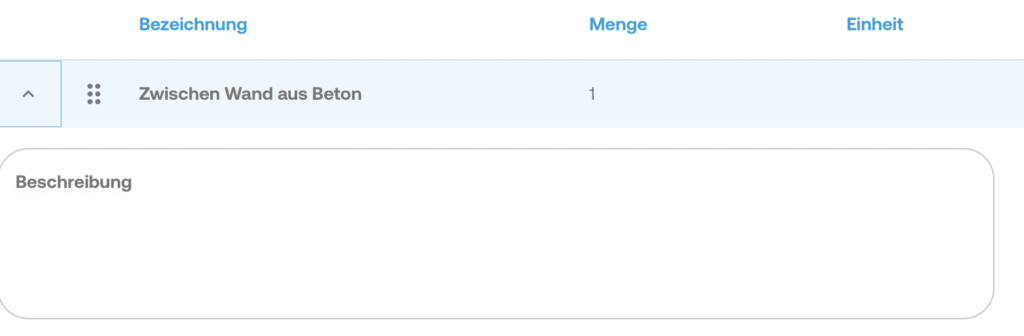 Klicke auf „Neue Position“, um direkt im Dokument eine neue Position hinzuzufügen. In der Listenansicht erscheint eine leere Zeile, in der du die folgenden Informationen eingeben kannst: