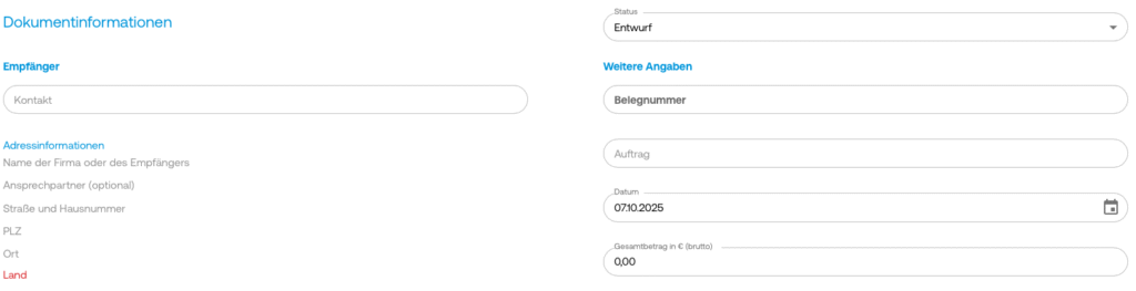Sobald du eine dieser Optionen gewählt hast, öffnet sich eine Seite, auf der du alle wichtigen Details zum Erstellen der Auftragsbestätigung ausfüllen kannst.