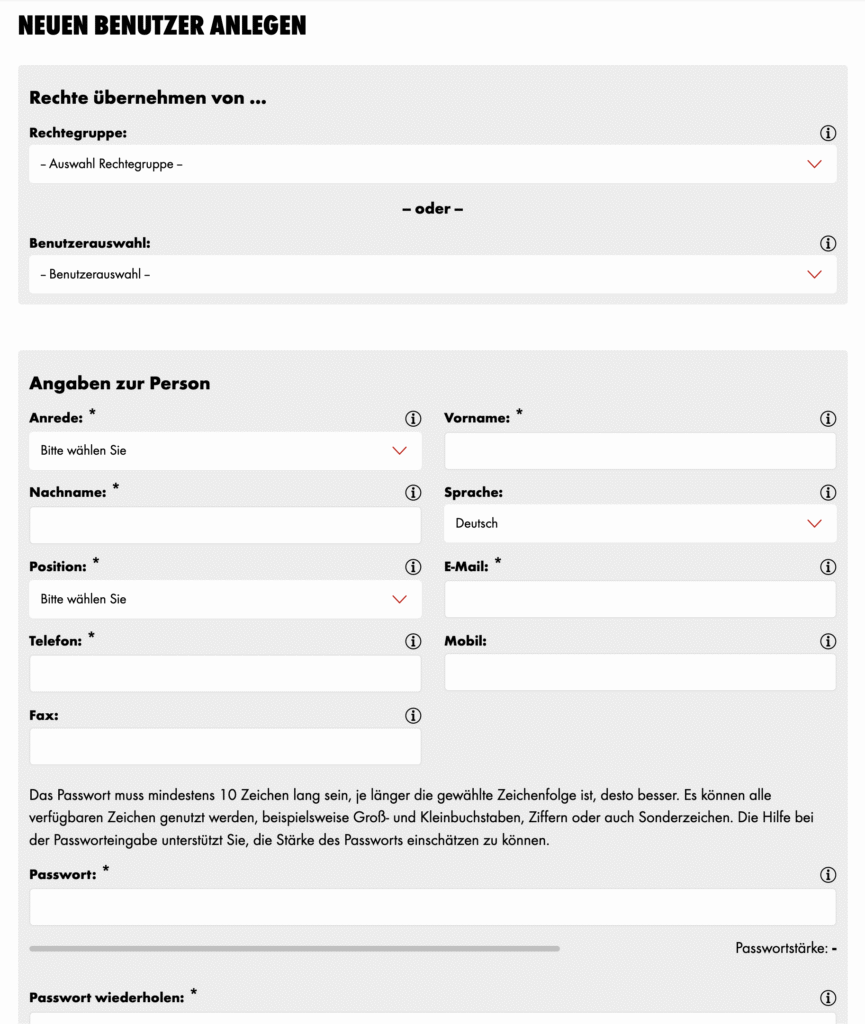 Fülle die Details des Nutzers aus. Der Mitarbeiter benötigt keine Firmen-Mail-Adresse; es ist auch möglich, ihn über seine private E-Mail-Adresse anzumelden.